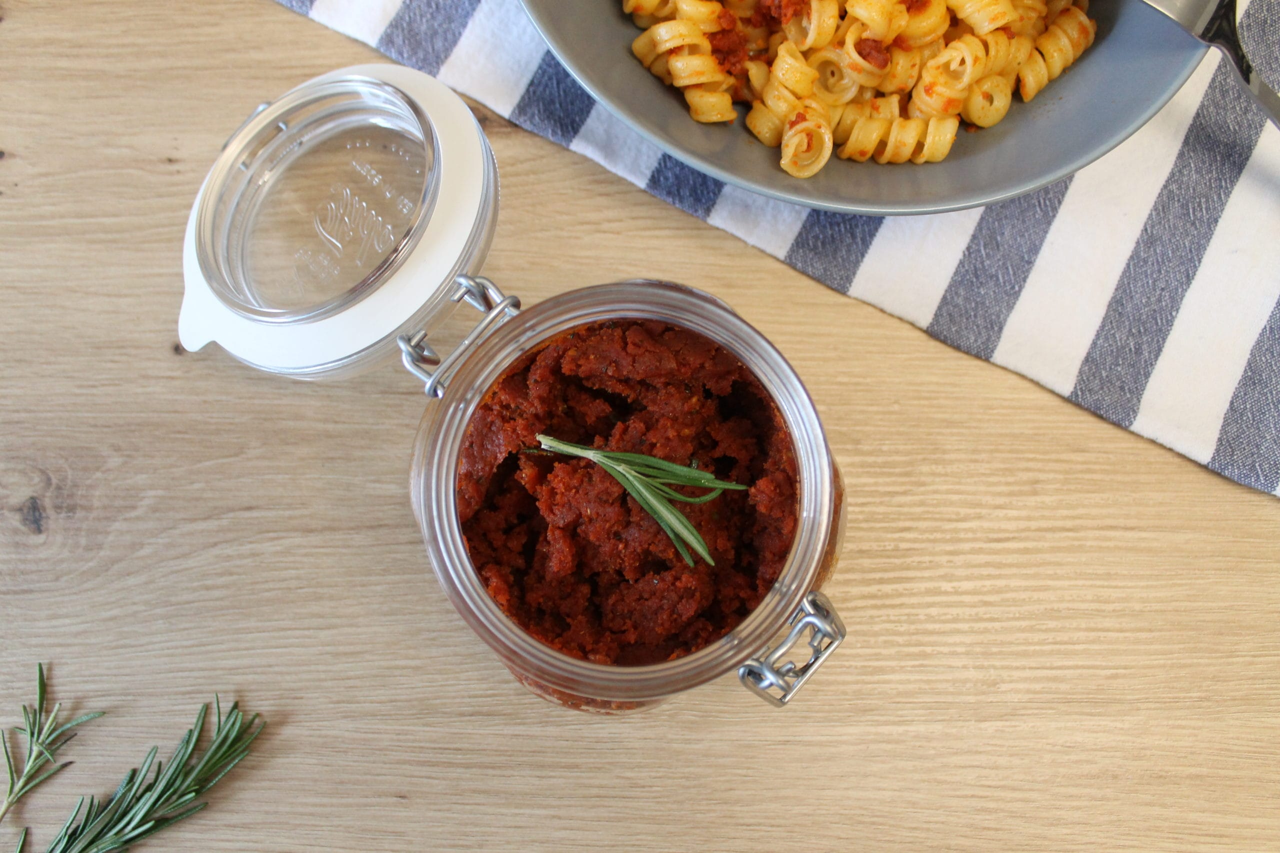 Ein Rezept für alle Vegetarier, Veganer, Pasta-Fans und alle, die gerne Dinge selbst machen. Der Geschmack frischer Tomaten in Form eines fruchtigen Pestos bringt nicht nur die Herzen von Pasta-Fans zum Schlagen. Es schmeckt genauso gut als Dip beim Baguette, als Sauce für das Raclette-Pfännchen oder mit etwas Schinken oder Käse im Sandwich-Toast. Treu dem Motto – Selbstgemacht schmeckt immer am besten – ist dieses Rezept nicht nur unfassbar lecker. Es ist dazu noch super einfach und schnell zubereitet. Probiere es selbst und genieße dein selbstgemachtes Pesto.